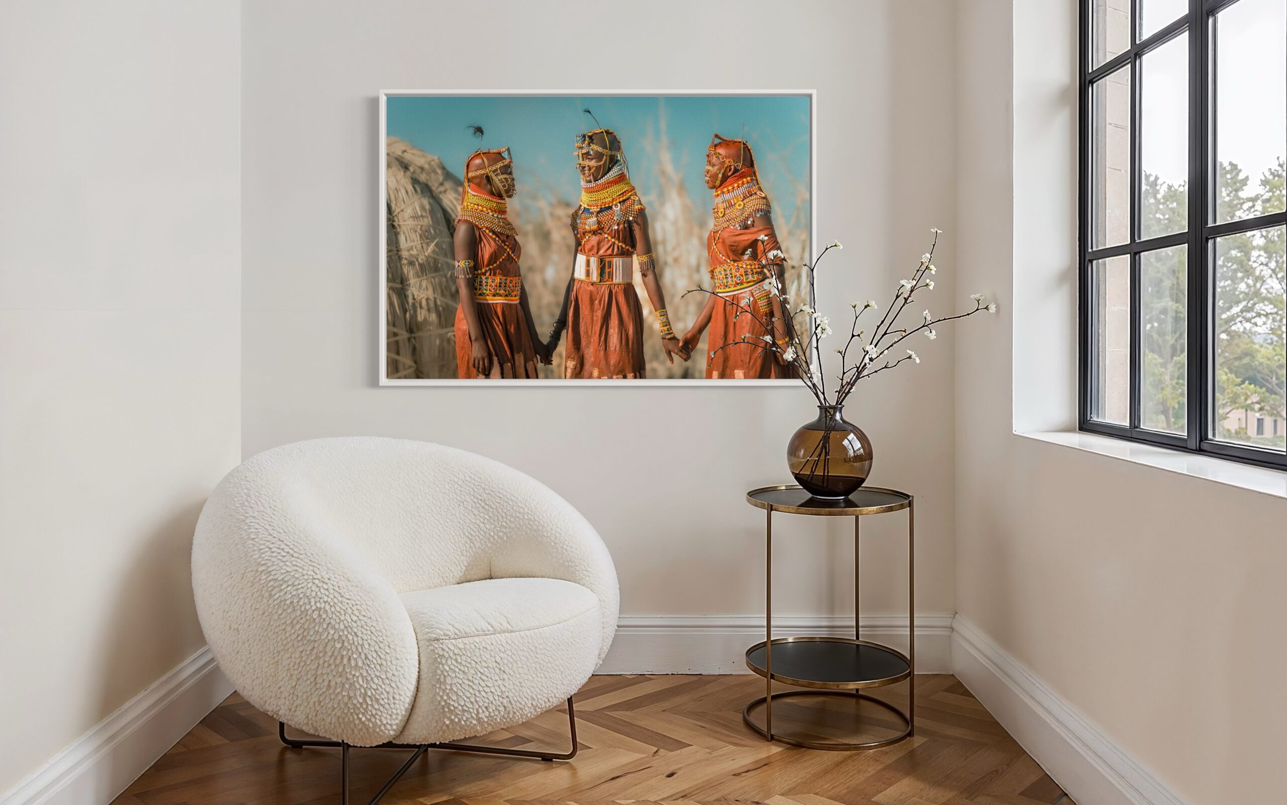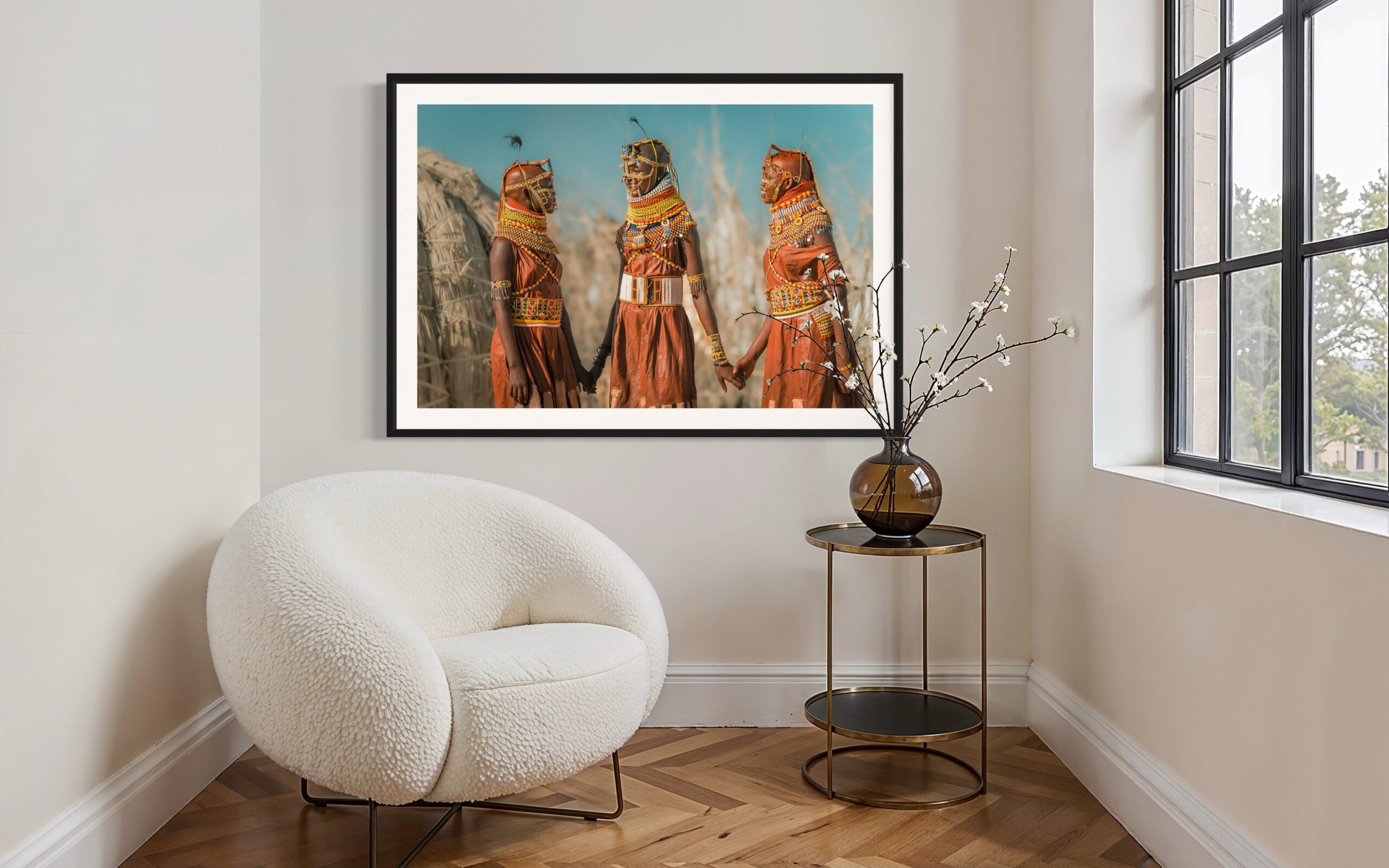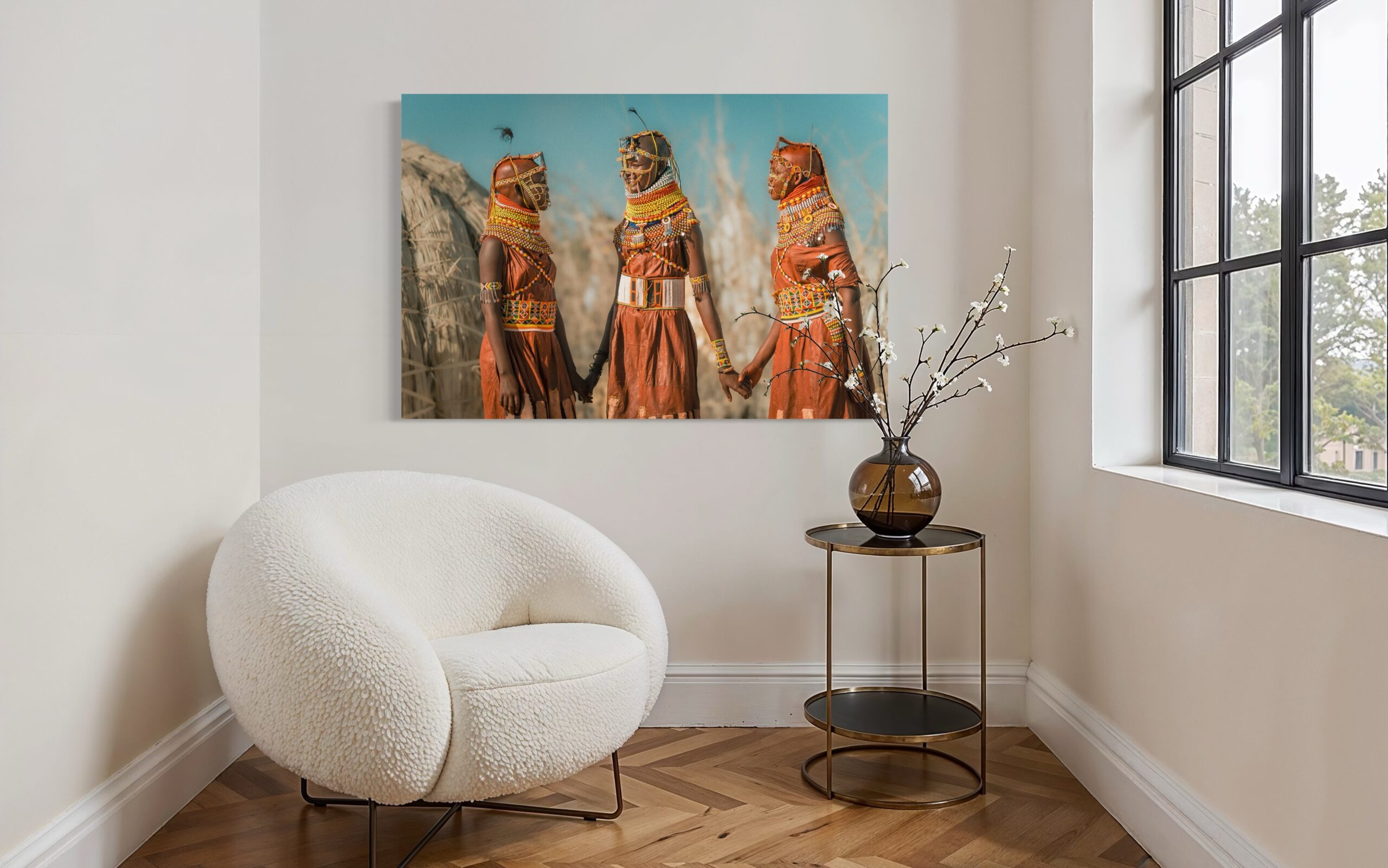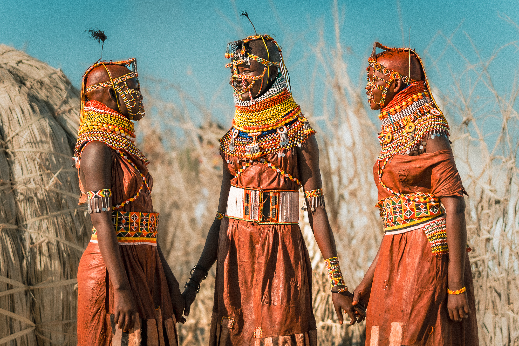 A harmonious display of tradition and unity amongst three unmarried Turkana girls, captured in vibrant attire and intricate beadwork.