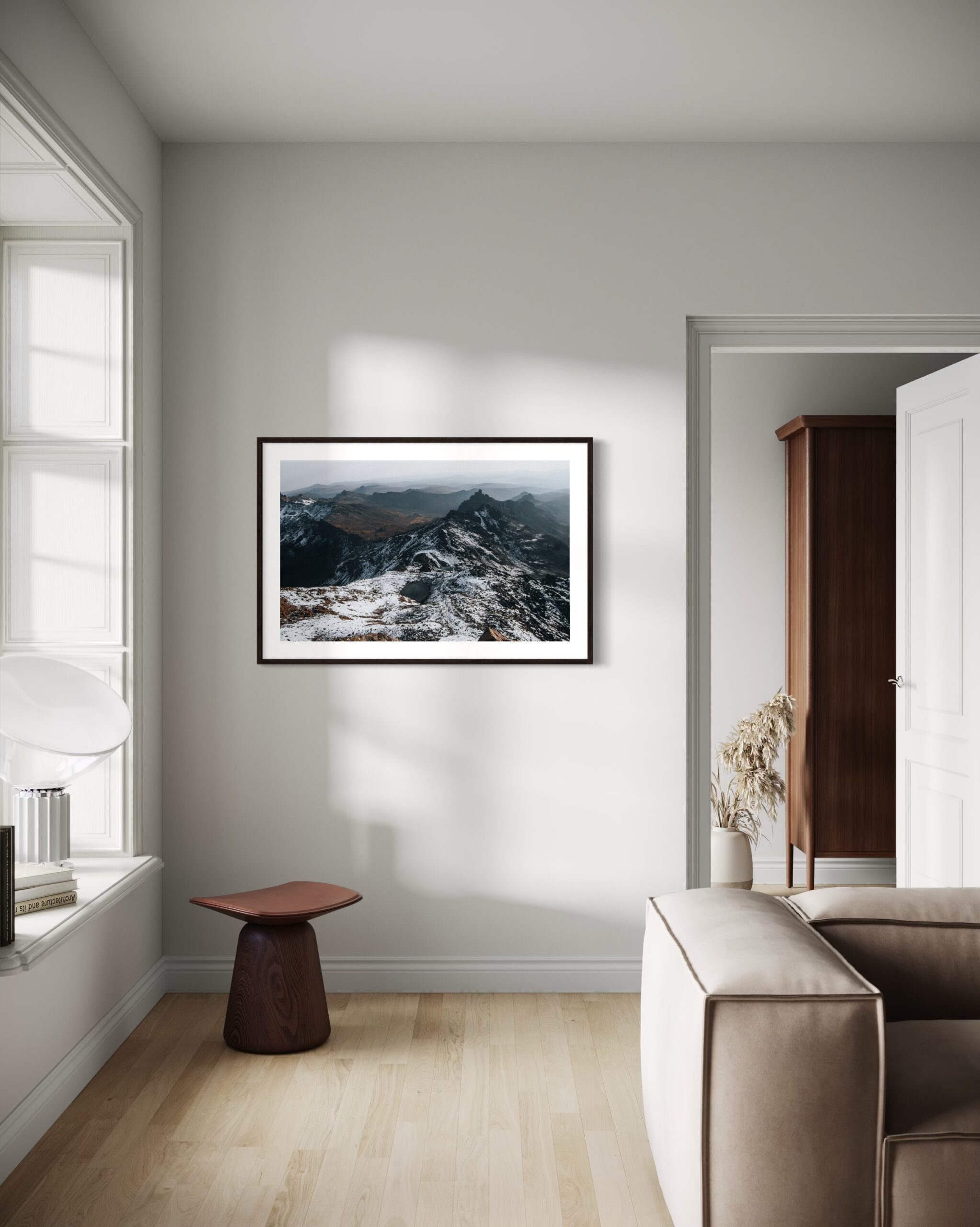 A breathtaking view of snow-capped Mt. Kenya stretching into the horizon – with the summit chill blanketing Harris Tarn – embodying the beauty in icy tranquility.
